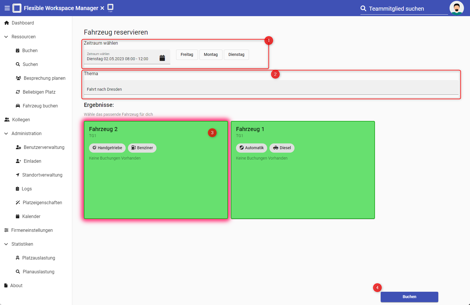 Damit man nicht jeden Sitzplan durchsuchen muss, ob und wo ein Fahrzeug frei ist, gibt es den Dialog zum Buchen eines Fahrzeuges.